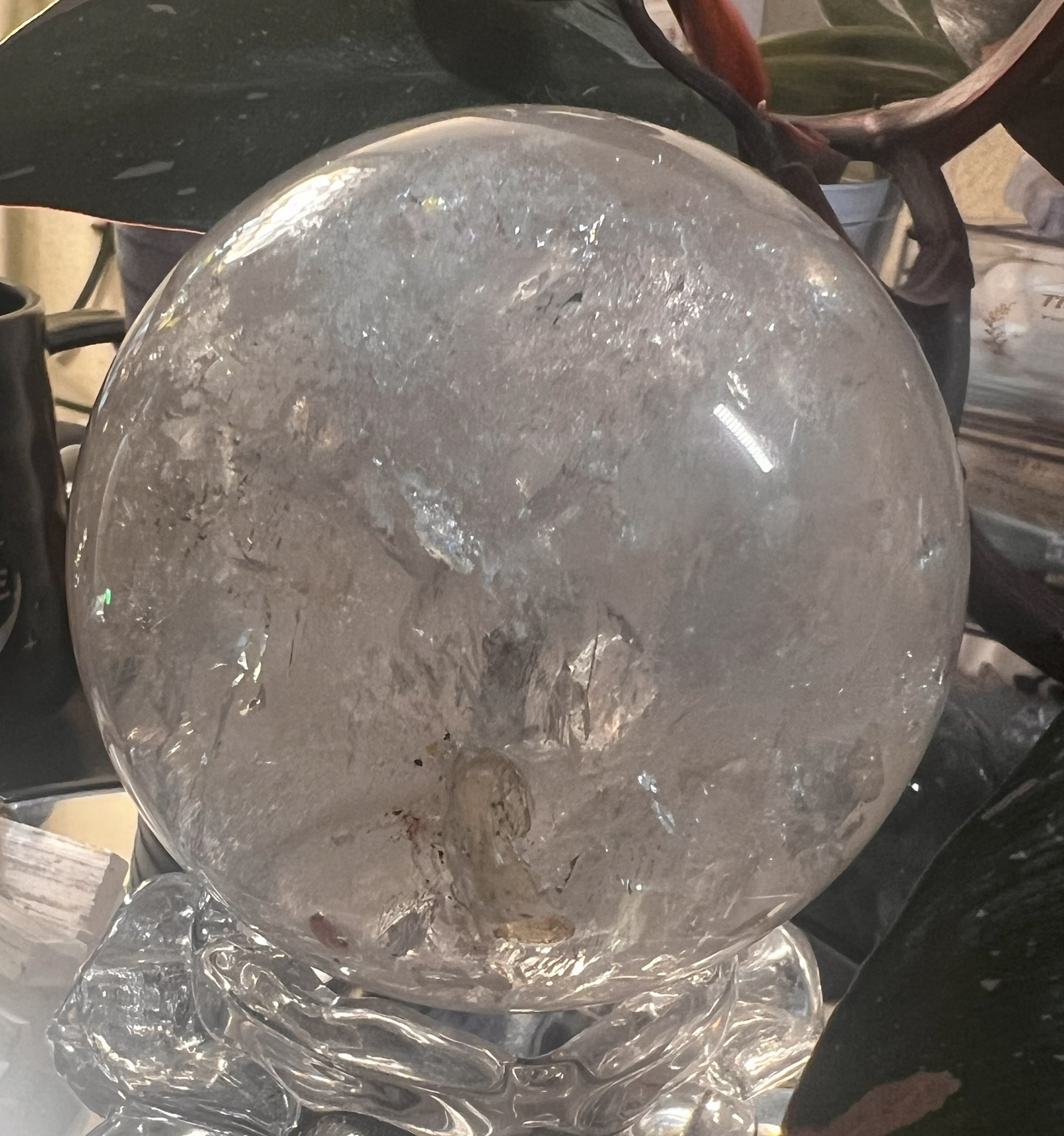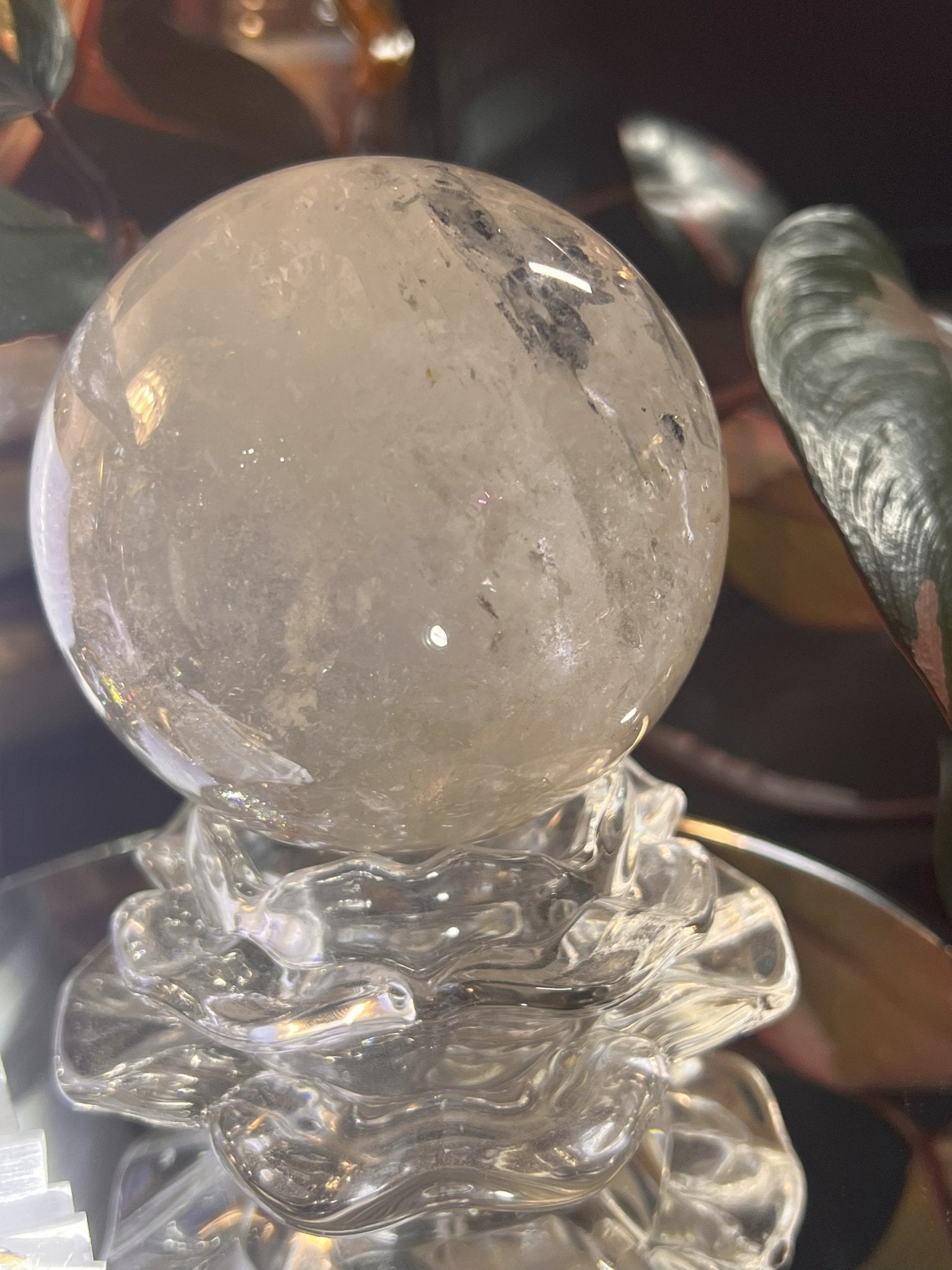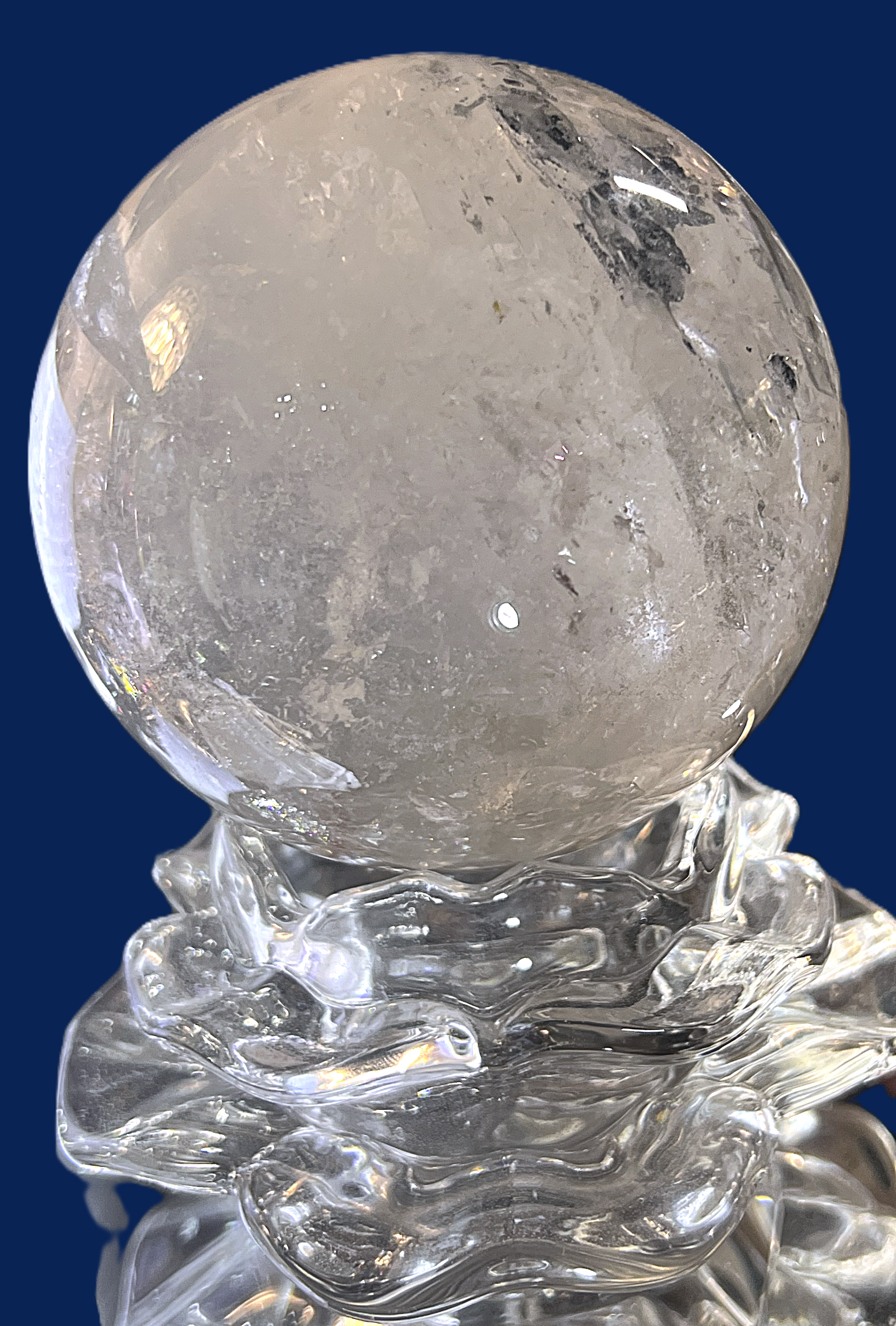 This mesmerizing Clear Quartz Sphere rests elegantly on a sculpted glass stand, emanating purity and clarity. Known as the "Master Healer," clear quartz is revered for its ability to amplify energy, enhance focus, and promote harmony. The flawless spherical shape symbolizes unity, infinity, and the interconnectedness of life.