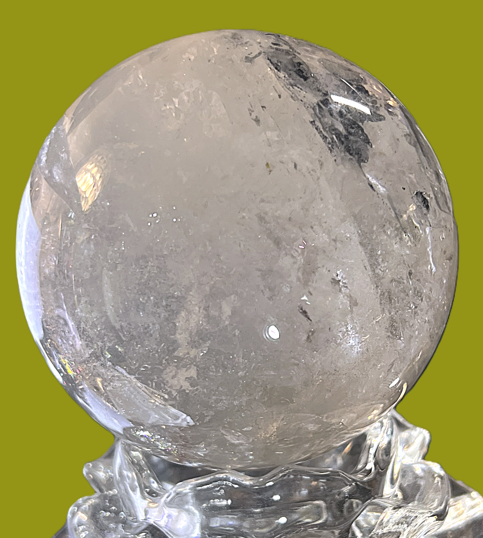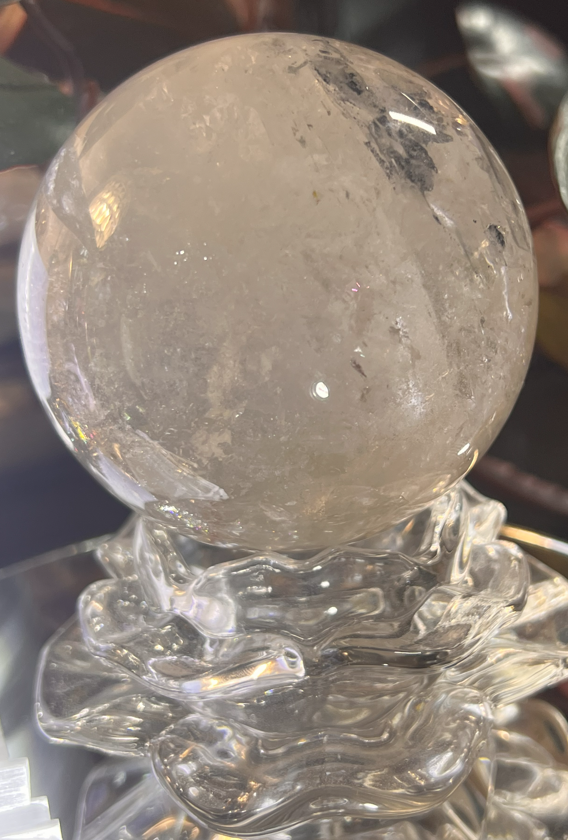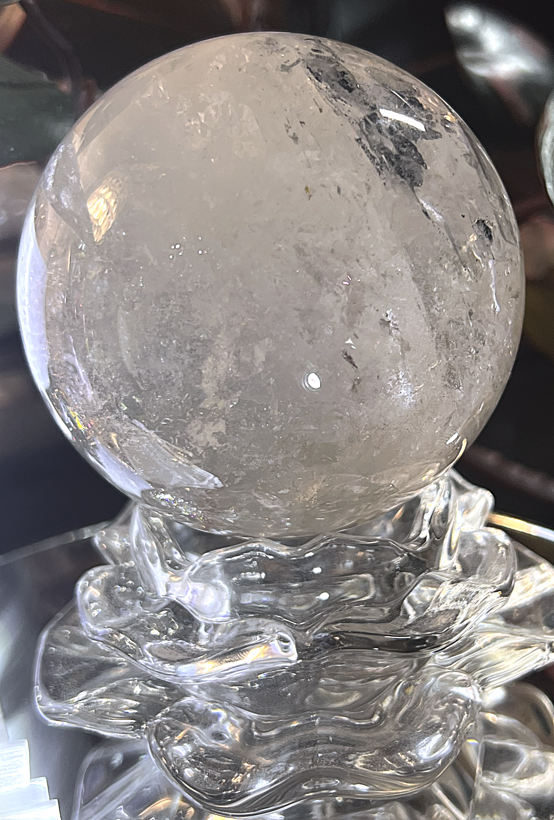 This mesmerizing Clear Quartz Sphere rests elegantly on a sculpted glass stand, emanating purity and clarity. Known as the "Master Healer," clear quartz is revered for its ability to amplify energy, enhance focus, and promote harmony. The flawless spherical shape symbolizes unity, infinity, and the interconnectedness of life.