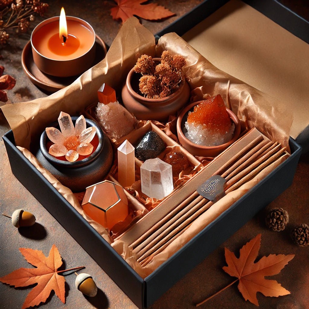 Welcome to the Mētztli Majestik Monthly Crystal Subscription Box, where nature’s beauty and spiritual wellness meet. This curated monthly collection brings together a harmonious assortment of crystals and tools, SIMILAR to the pictured. It includes three crystals (eg. citrine, carnelian, and smoky quartz), a small handcrafted candle in a handmade cement or glass holder, an incense sticks. The entire collection is packaged in a luxurious black box lined with colored tissue paper, perfectly complementing the earthy and vibrant tones of the season.