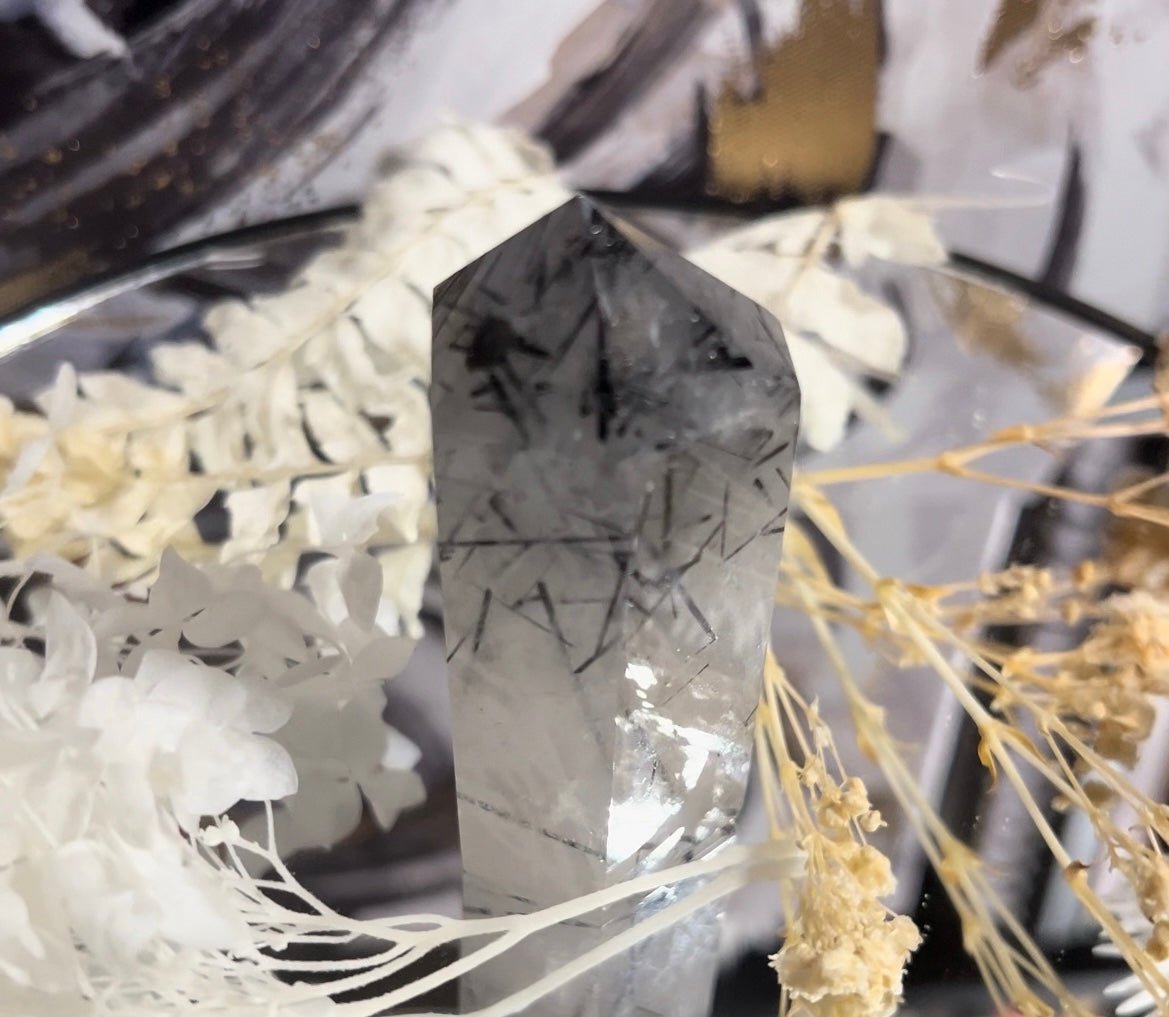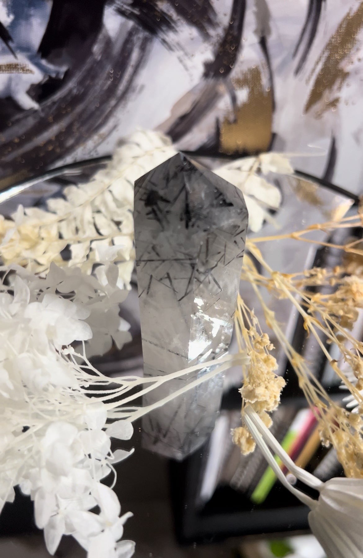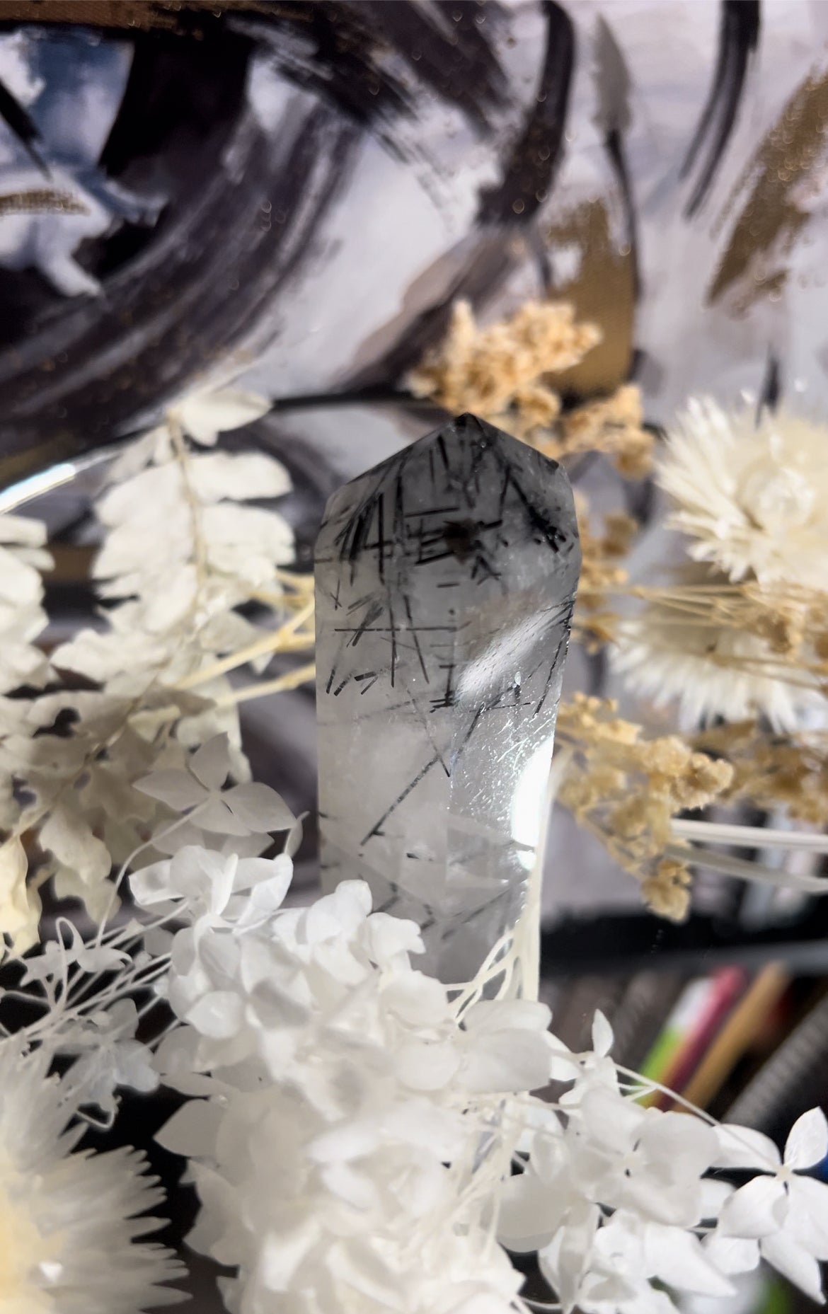 These images feature a stunning Natural Black Tourmaline Rutilated Quartz crystal in a polished tower formation. The clear quartz matrix is beautifully interwoven with striking black tourmaline needles, creating a mesmerizing pattern of contrast and texture. The crystal’s transparency allows light to pass through, highlighting the intricate inclusions. This powerful combination of quartz and black tourmaline is both captivating and energetically potent, making it a versatile and meaningful piece for energy work, protection, and spiritual growth.