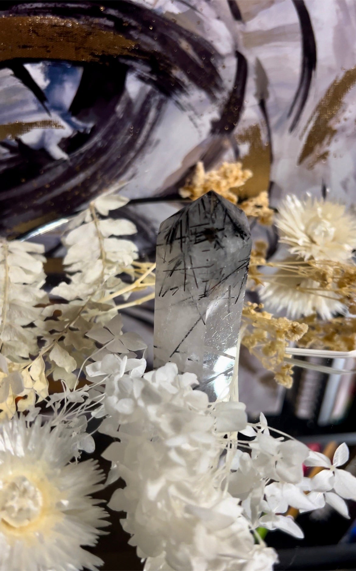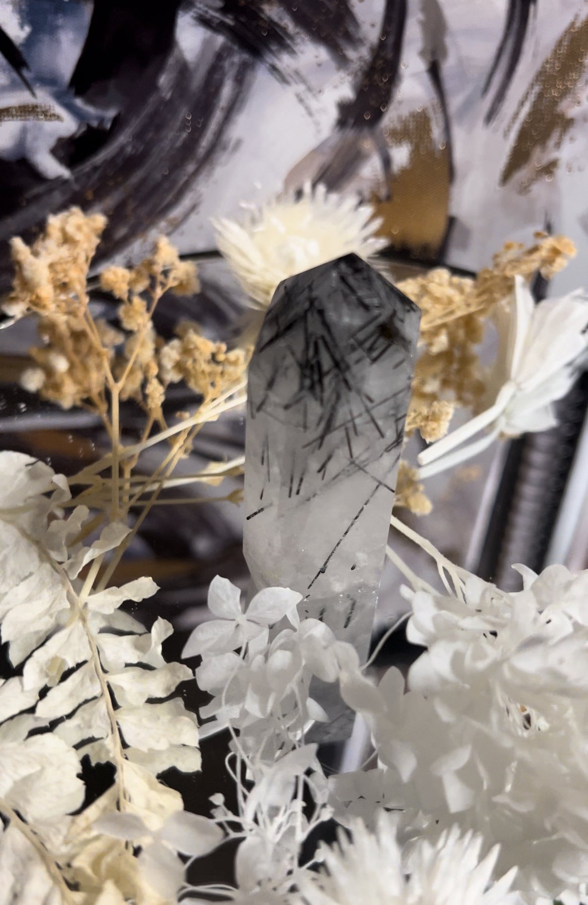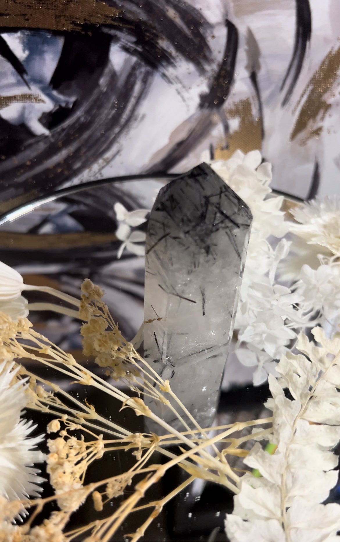 These images feature a stunning Natural Black Tourmaline Rutilated Quartz crystal in a polished tower formation. The clear quartz matrix is beautifully interwoven with striking black tourmaline needles, creating a mesmerizing pattern of contrast and texture. The crystal’s transparency allows light to pass through, highlighting the intricate inclusions. This powerful combination of quartz and black tourmaline is both captivating and energetically potent, making it a versatile and meaningful piece for energy work, protection, and spiritual growth.
