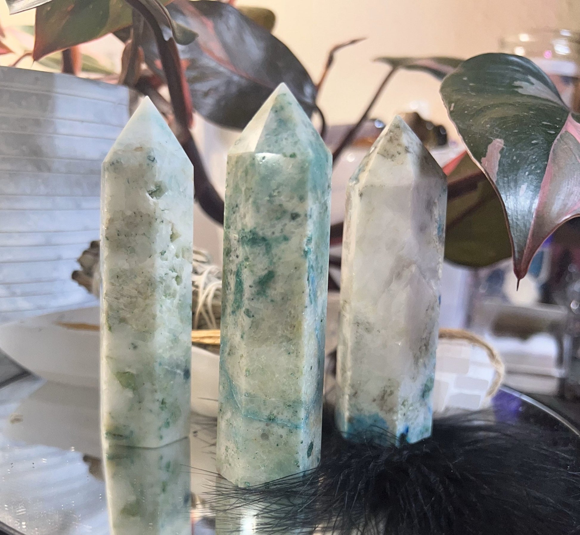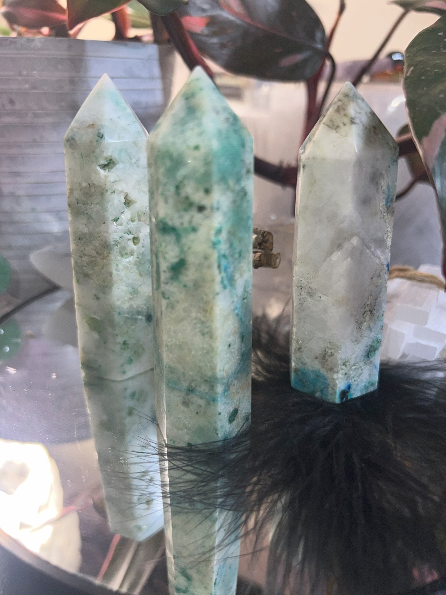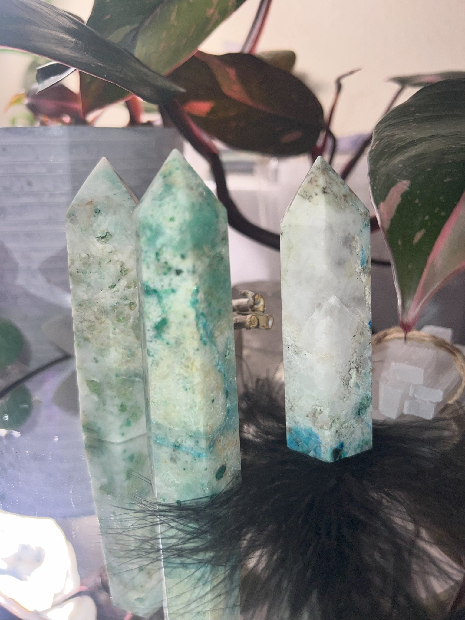The Phoenix Stone, also known as Chrysocolla with Malachite, is a powerful crystal that embodies renewal, courage, and transformation. These vibrant green and turquoise crystal towers radiate serenity and strength, with patterns resembling the mythical phoenix rising from the ashes. Each piece features a unique interplay of colors, blending calming green hues with energizing blues and whites, symbolizing the balance of emotional and physical energies.