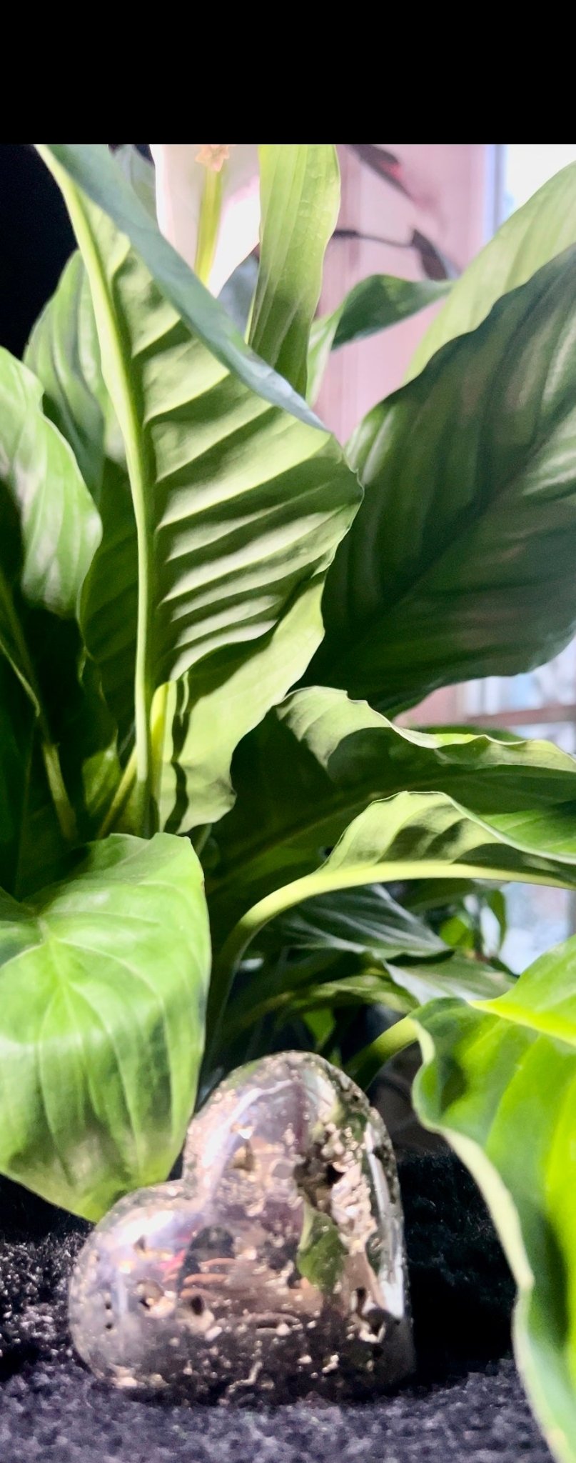 This image features a stunning polished heart-shaped pyrite crystal. The metallic luster of the pyrite gleams brightly, reflecting its unique golden sheen. Natural formations and crevices within the crystal showcase its raw, earthy character, blending beautifully with its polished exterior. The heart rests on a soft black surface, contrasting against the vibrant green leaves in the background, which add a serene and natural touch to the composition. The combination of textures and colors highlights the crystal's grounding energy and natural beauty.