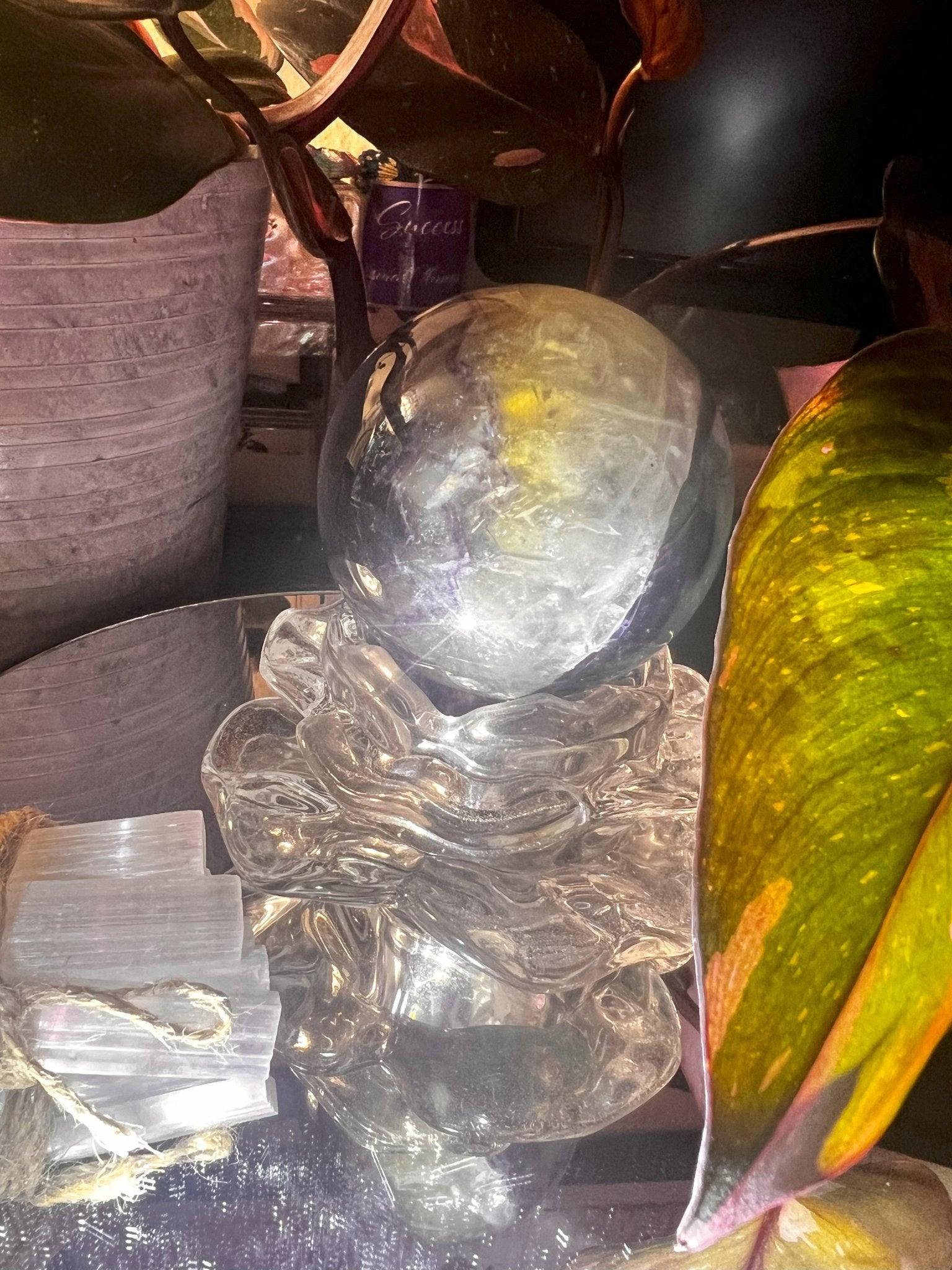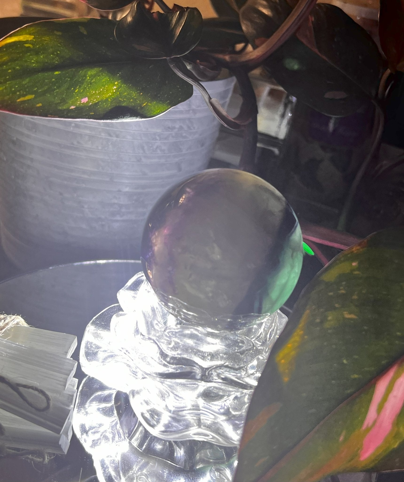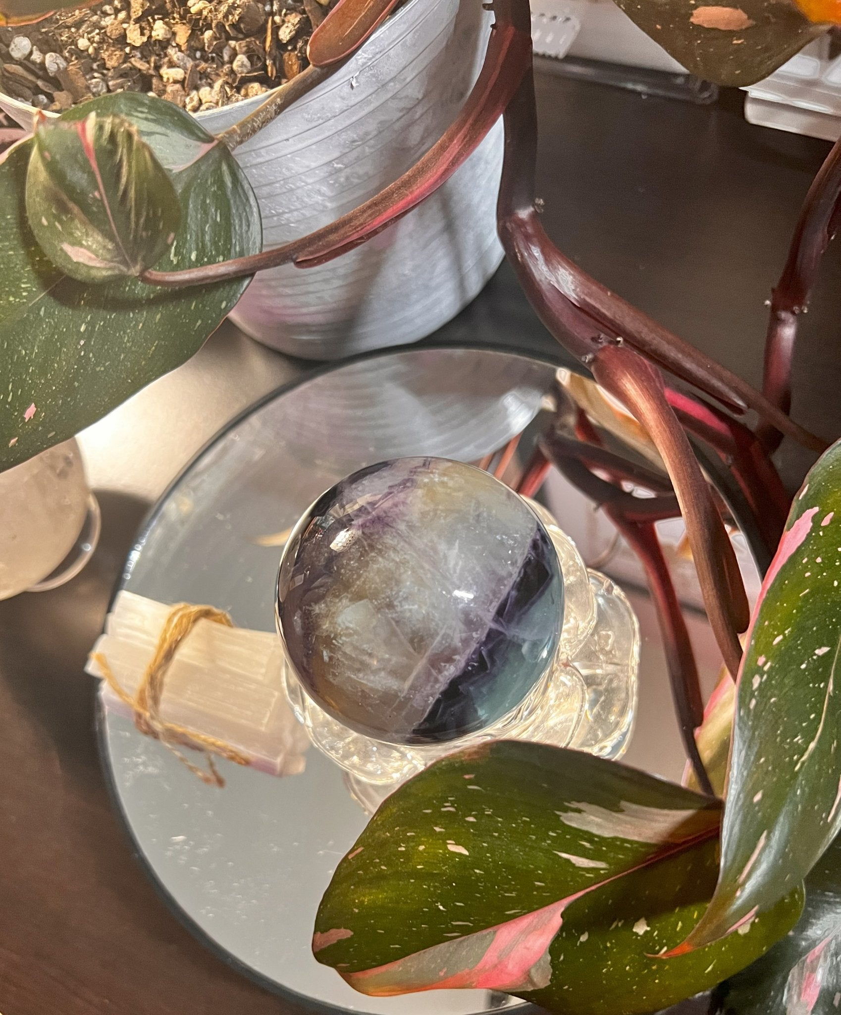 Complemented by the reflective mirror base and surrounded by natural elements like selenite and greenery, this fluorite sphere is not only a spiritual tool but also a piece of art that connects you to nature’s serenity.