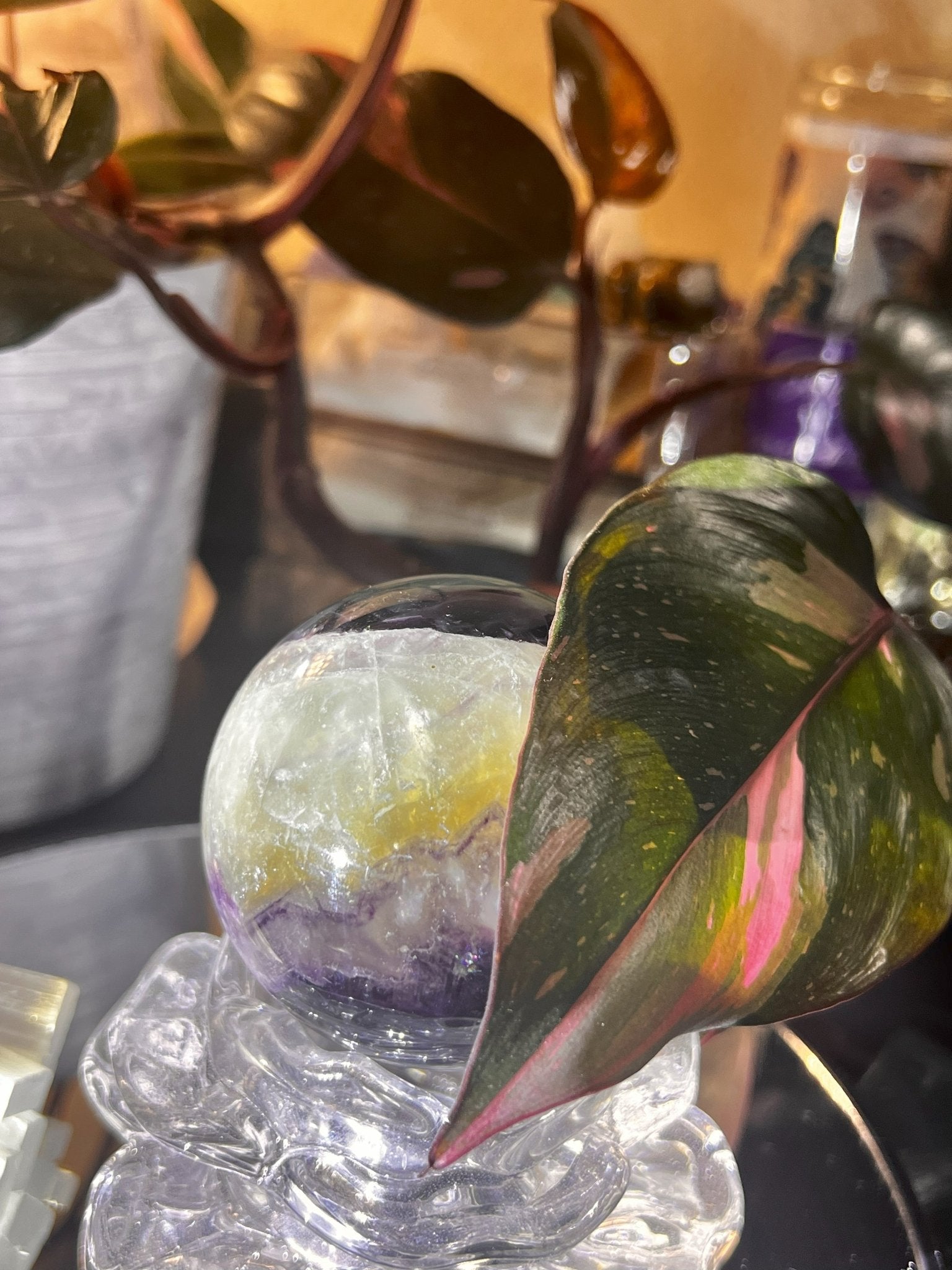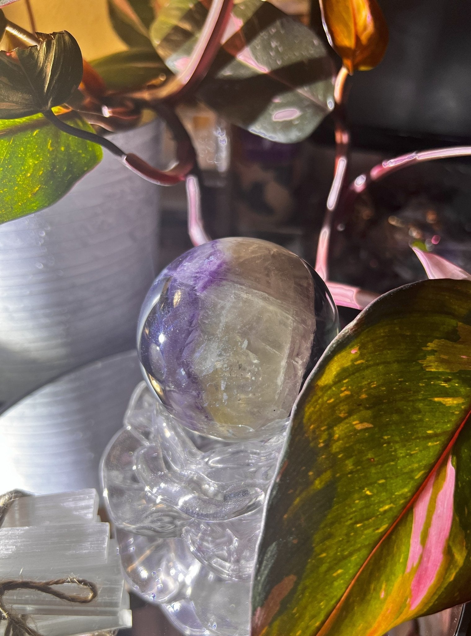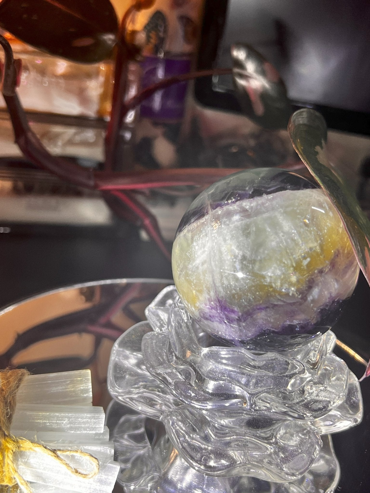 This stunning Fluorite Sphere showcases a mesmerizing blend of colors, from soft purples and greens to hints of golden hues, symbolizing harmony and balance. Resting on an elegant glass pedestal, it exudes sophistication while offering powerful metaphysical benefits. Fluorite is revered for its ability to enhance mental clarity, promote emotional stability, and protect against negative energies. The sphere's smooth, polished surface radiates a calming energy, making it perfect for meditation, workspace enhancement, or simply as a captivating centerpiece in your home.