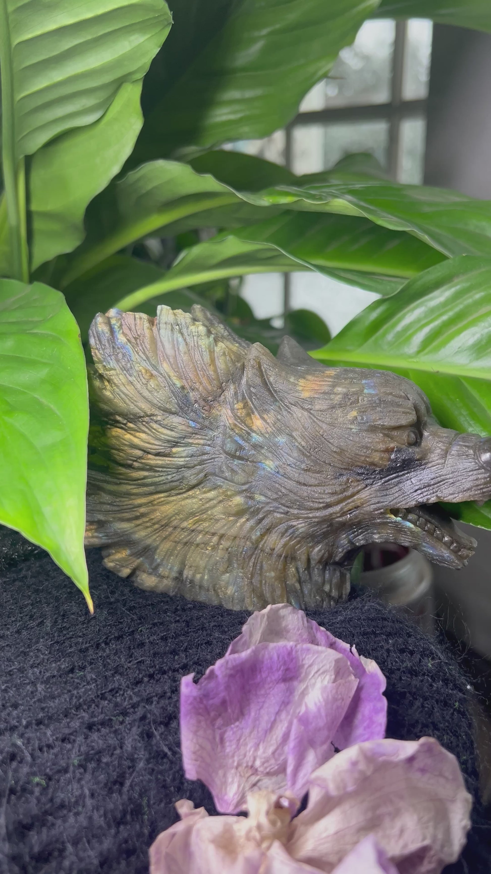 The Labradorite wolf head combines the metaphysical properties of labradorite with the symbolism of the wolf, creating a piece that is both protective and empowering: