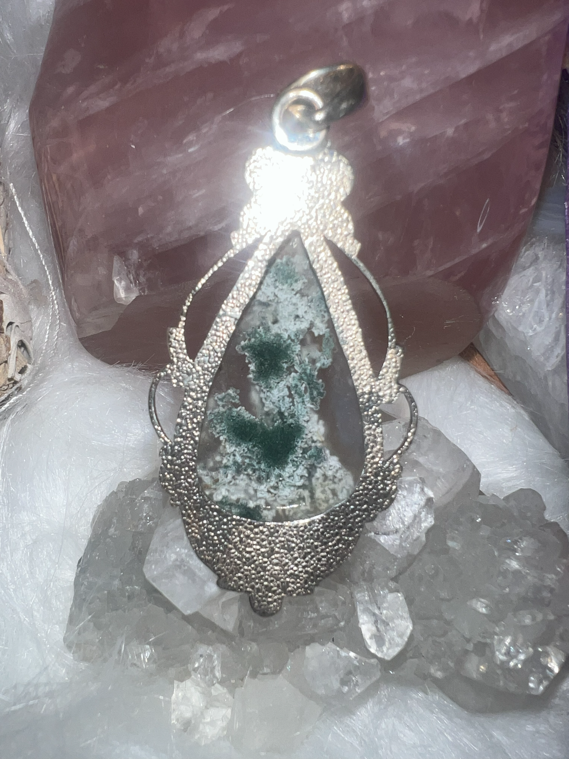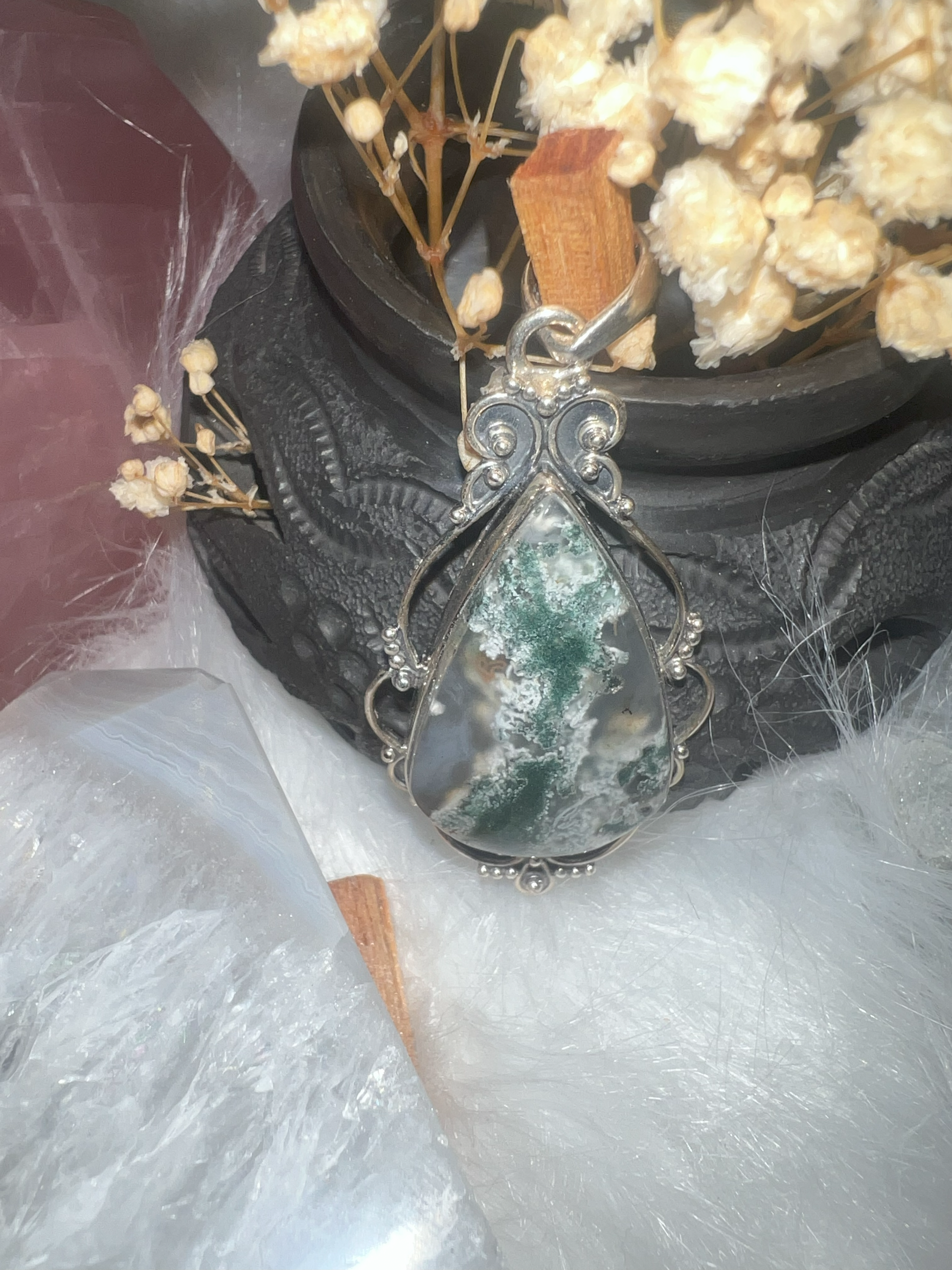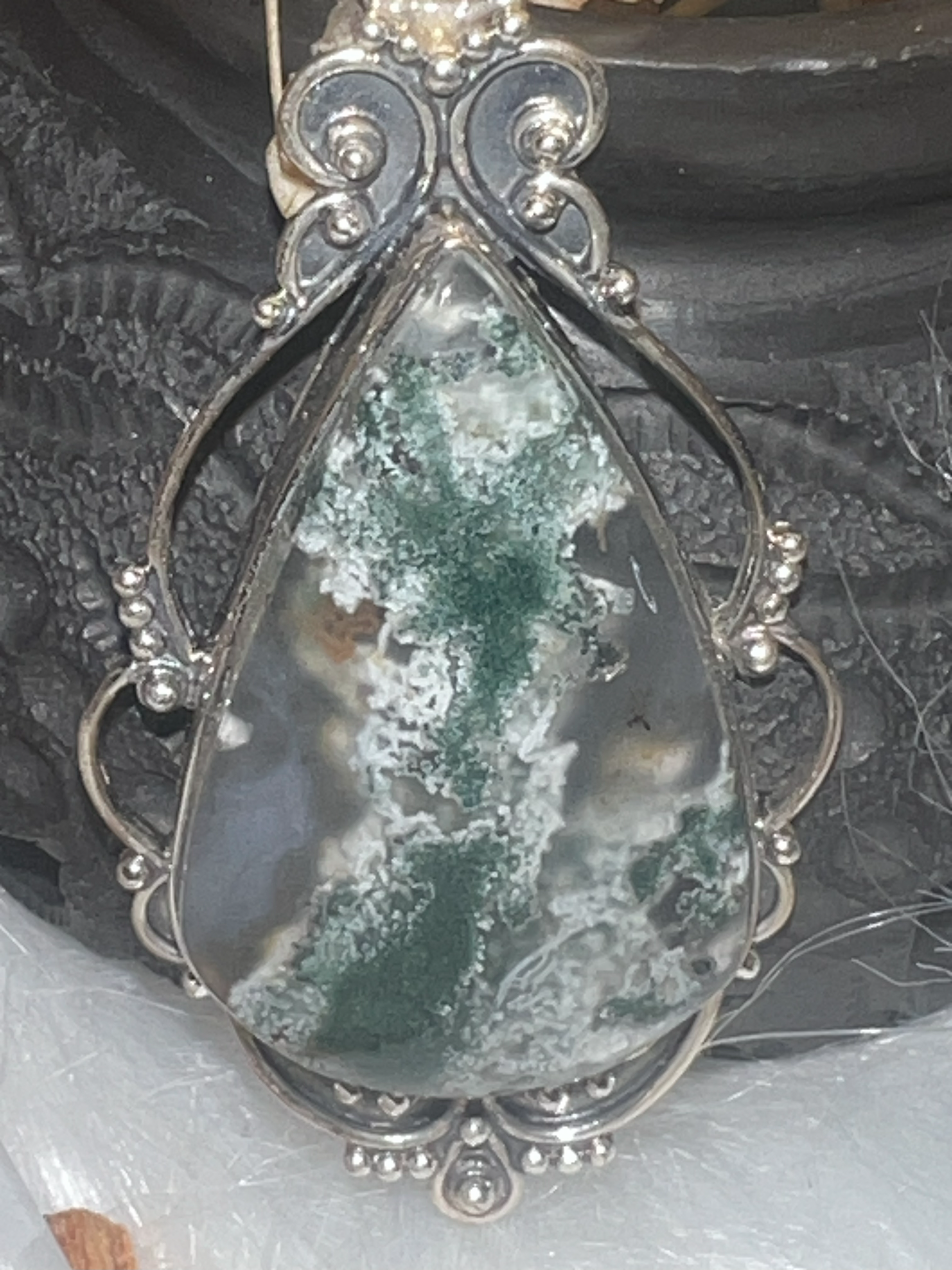 Reconnect with the grounding energy of nature through our 'Verdant Harmony' pendant. This stunning piece features a Moss Agate stone, showcasing intricate, earthy green patterns that evoke serene forest landscapes. Framed in elegant sterling silver, the 2.25" by 1" pendant is both a statement piece and a spiritual talisman. Known as the 'Stone of Growth and Abundance,' Moss Agate inspires harmony, grounding, and prosperity, making it a meaningful addition to your crystal collection or a thoughtful gift for nature lovers. Handcrafted with care, this pendant brings a piece of the Earth's tranquility to your everyday life